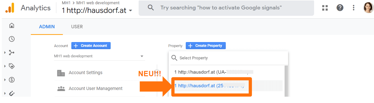 Hinweis: Das erkennst du auch daran, dass GA4 Properties keine UA-ID (UA-123456-1) mehr haben, sondern „normale“ Nummern (2543567).