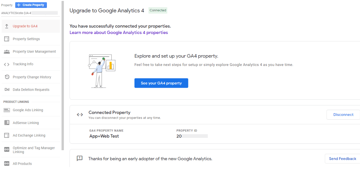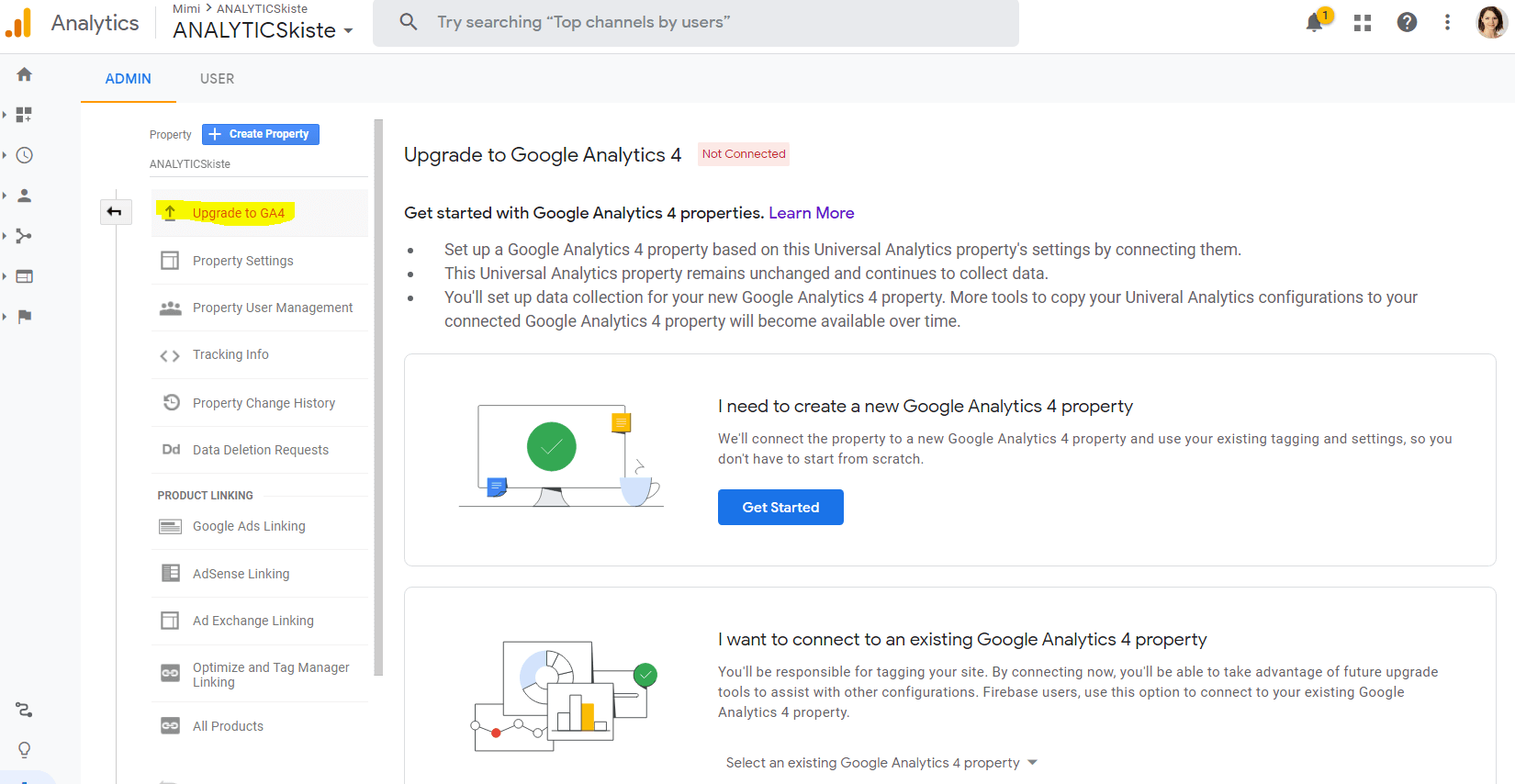 Screenshot: Google Analytics 4 Upgrade auf Property Ebene