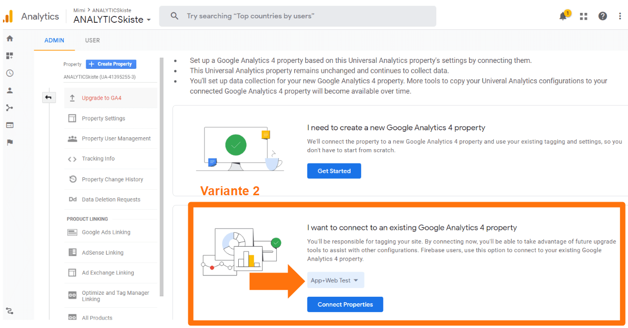 Um eine bestehende UA Property auf GA4 upzugraden gibt es zwei Möglichkeiten: