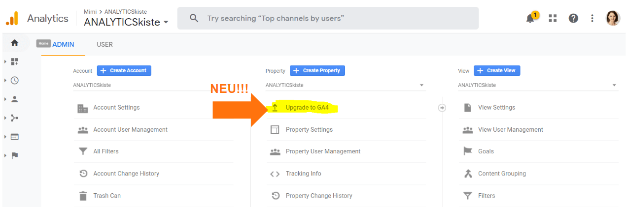 Vielleicht ist dir dieser Upgrade-Button in deinem bestehenden Google Analytics Account aufgefallen: