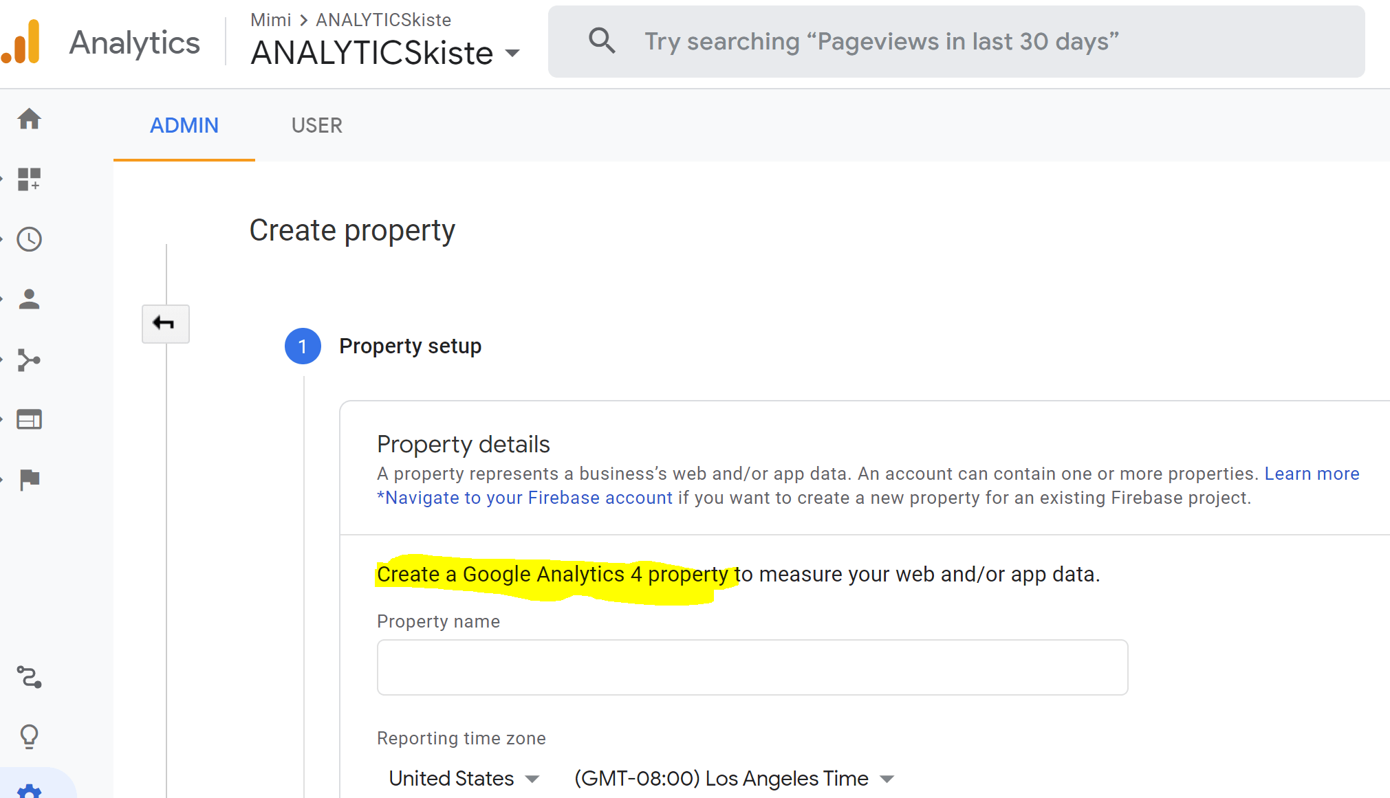 Screensot: Google Analytics 4 – Create a new GA4 Property