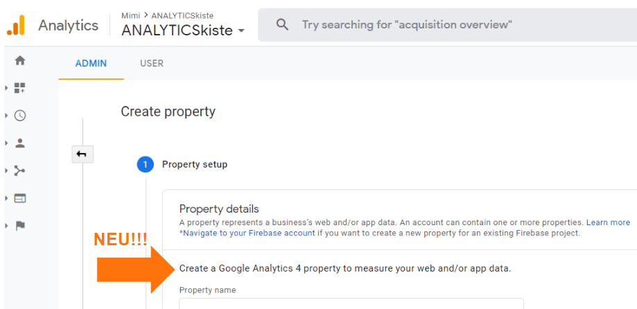 Screenshot: Google Analytics 4 – Komplett neue Property erstellen