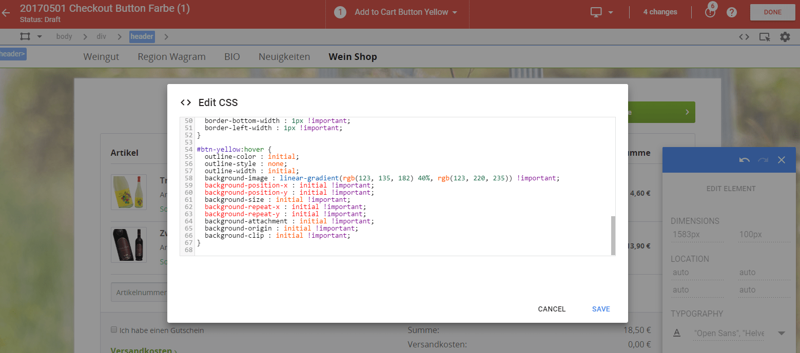 Der visuelle Editor ist fein für kleinere Design Änderungen auf der Website: Button Farbe ändern, Call to Action Texte tauschen, …