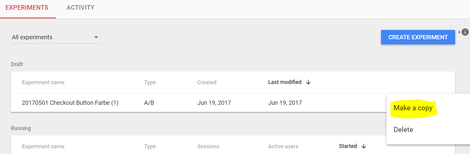 Ein kleiner Trost: Das Experiment kann ganz einfach kopiert werden. Die Testvarianten werden beim kopieren mit übernommen. Es müssen nur Objectives und Targeting nochmals eingestellt werden, danach kann das alte neue Experiment wieder live gehen.