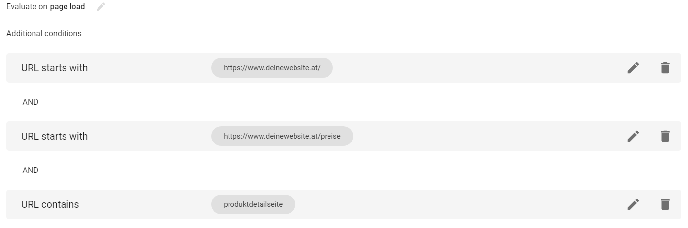 Deine Regel könnte z.B. so aussehen: URL beginnt mit https://www.hausdorf.at -> dann wird der Test auf allen Seiten ausgespielt, die mit https://www.hausdorf.at beginnen, also auf allen Seiten der www-Subdomain.