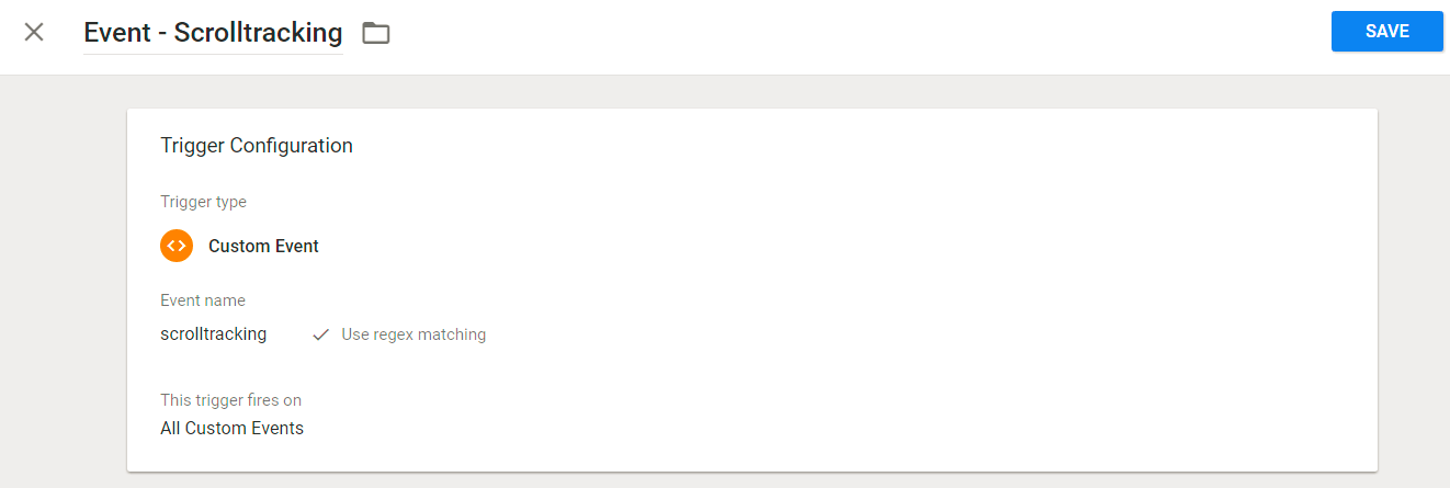 - Trigger: Es muss ein neuer Trigger angelegt werden, der auf das im Code genannten Event „scrolltracking“ hört.