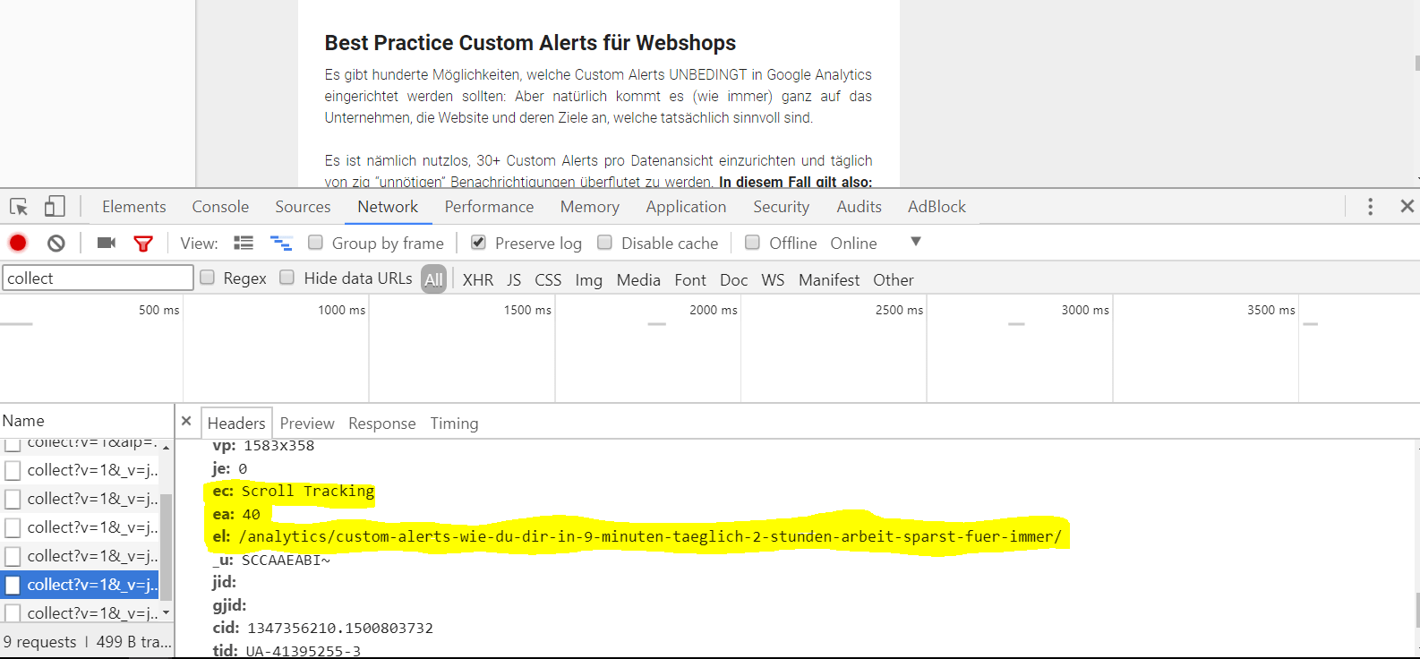 Ein Blick in die Developer-Console… und beim scrollen schossen mir nur so die Events um die Ohren: Ich habe in meinem Trigger 10er Schritte eingebaut, d.h. wenn ich auf meinem Blog 10%, 20%, 30%… 90%, 100% scrolle, dann wird jedes Mal ein Event abgefeuert. Sprich: 10 Events pro Blogartikel.