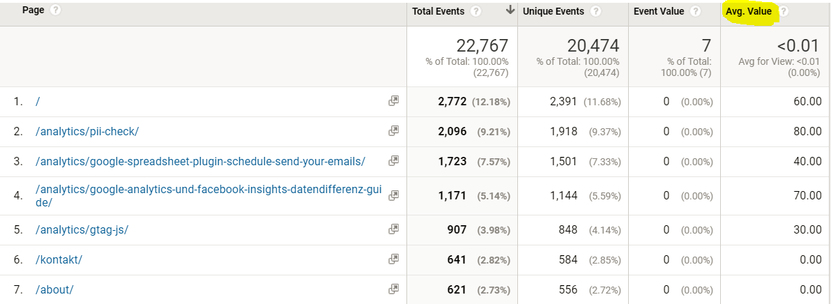 Hinweis: Um die durchschnittliche Scrolltiefe pro Seite zu analysieren, wird die Scrolltiefe zusätzlich zur „Event Action“ in den „Event Value“ geschrieben. In Google Analytics unter Verhalten –> Ereignisse –> Seiten erhälst du dadurch eine wunderbare Übersicht über die durchschnittliche Scrolltiefe pro Seite.