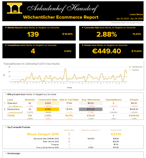 Das hier ist bspw. mein wöchentliches Ecommerce Dashboard, dass ich für das Bioweingut Arkadenhof Hausdorf in Google Sheets gebastelt habe: