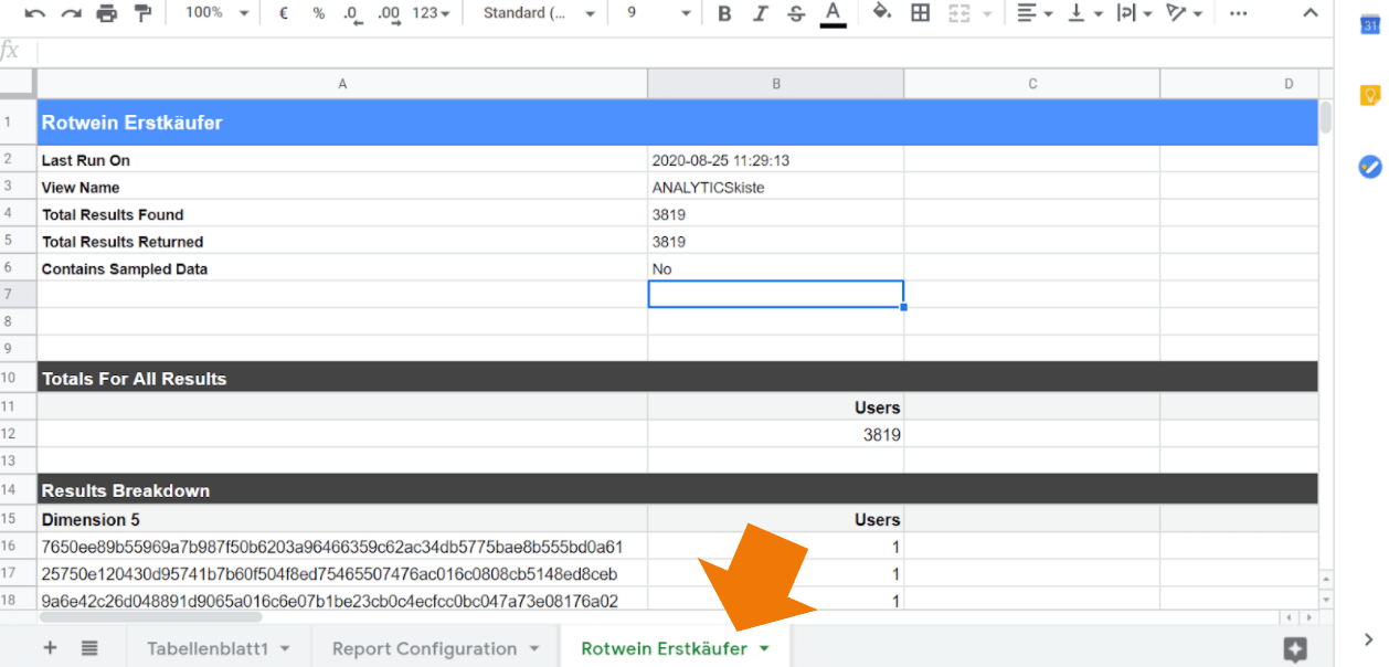 Im ersten Schritt holst du dir das gewünschte Google Analytics Segment über das Google Analytics Sheets Addon nach Google Sheets.