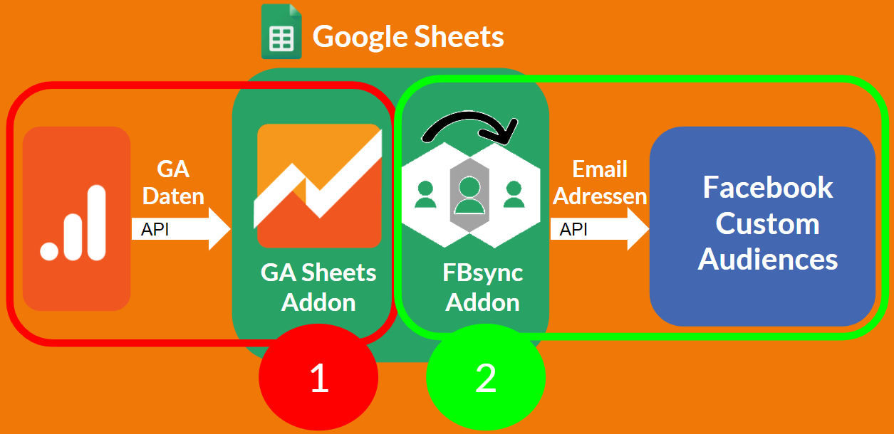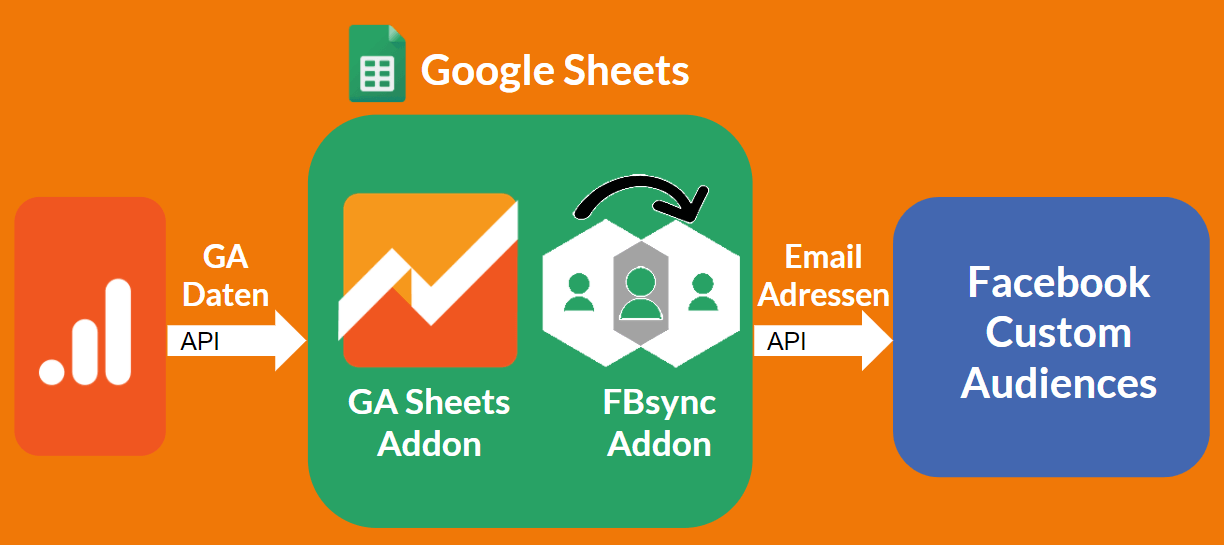 Ist die Email Adresse in Google Analytics verfügbar, kann diese im Anschluss über das Google Analytics Sheets Addon in Google Sheets abgefragt und mit dem FBsync Addon nach Facebook gepusht werden.
