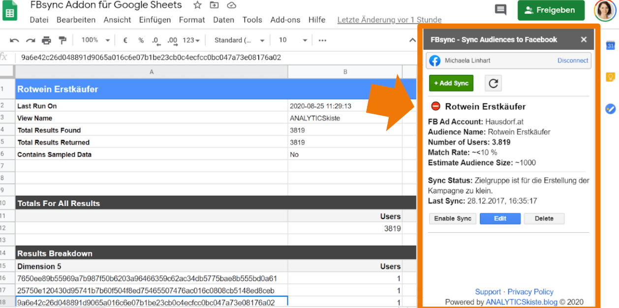 Simpel gesagt: Das FBsync Tool ist ein Google Sheets Addon, dass über eine Schnittstelle zu Facebook verfügt mit dem Email Adressen* von spezifischen User-Segmenten aus Google Analytics nach Facebook Custom Audiences gesendet werden können.