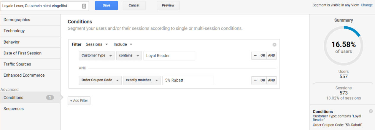 Der große Vorteil: In Google Analytics können Segmente nicht nur für die Datenanalyse eingesetzt werden, sondern auch für das Audience Management.