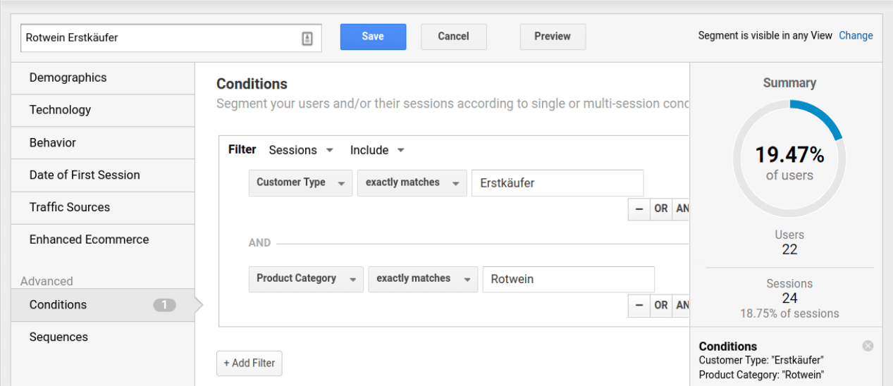Der große Vorteil: In Google Analytics können Segmente nicht nur für die Datenanalyse eingesetzt werden, sondern auch für das Audience Management.