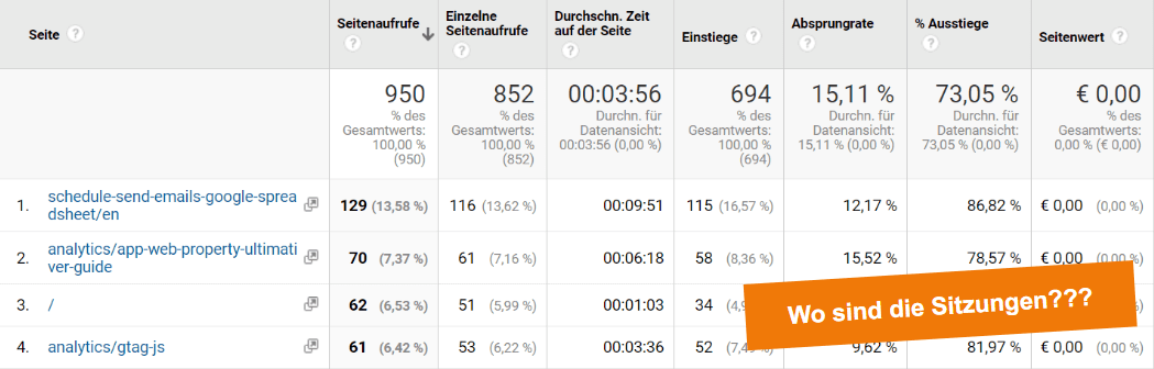 Das fällt spätestens dann auf, wenn du analysieren möchtest wie oft Seite X Teil einer Sitzung war, die Metrik „Sitzungen“ jedoch im Seiten-Report unter Verhalten → Websitecontent → Alle Seiten garnicht nicht vorhanden ist: