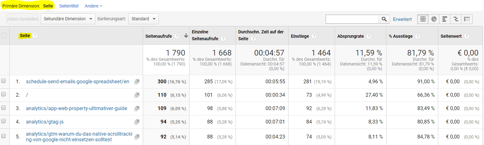 Wenn du wissen möchtest wie oft eine Landingpage aufgerufen wurde, musst du in den Detail-Report „Alle Seiten“ springen: Hier hast du die Seitenaufrufe (????) pro Seite (????).