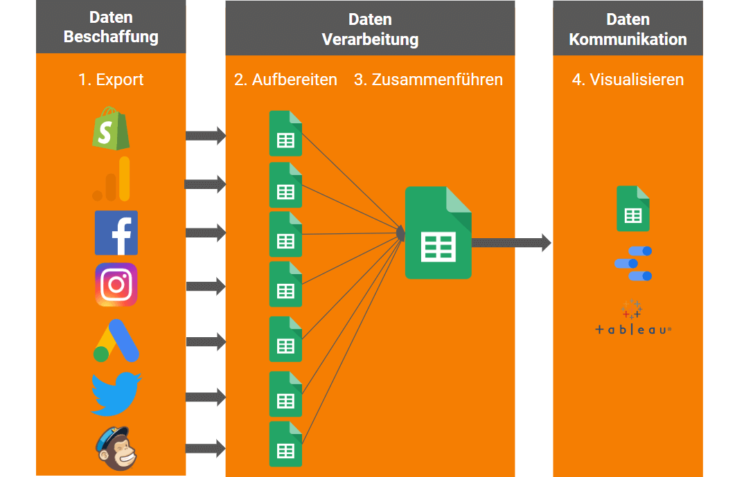 Statt Excel bietet sich für das Abgreifen der Daten aus Shopify, Google Analytics, Facebook, Instagram, Google Ads, Twitter, Mailchimp & Co Supermetrics für Google Sheets an.