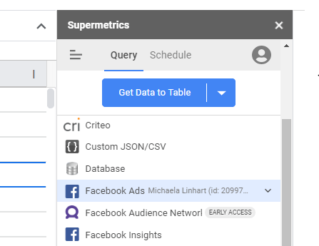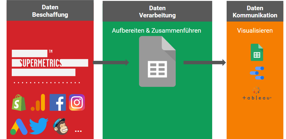 In aller Kürze: Supermetrics ist ein Tool, dass über zahlreiche Konnektoren verfügt mit dem du Daten aus 50+ unterschiedlichen Datenquellen wie Facebook, Bing und Mailchimp abgreifen kannst.