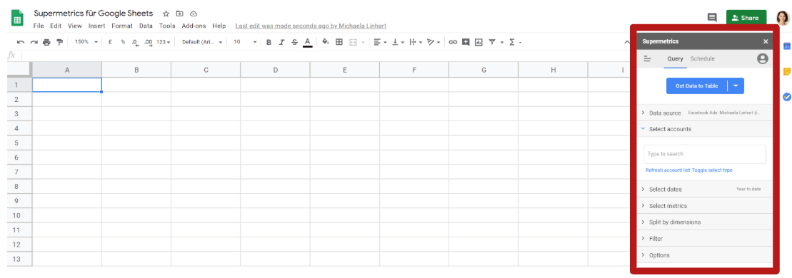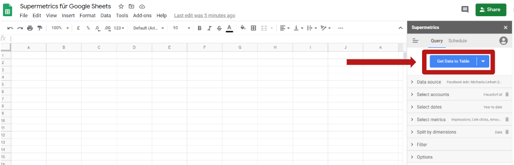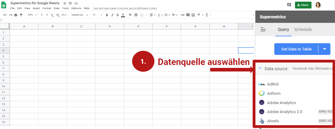 Im Folgenden zeige ich dir, wie du deine Daten am besten & einfachsten mit Supermetrics abgreifst und mit Google Sheets verarbeitest: