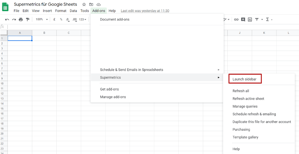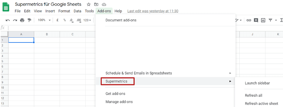 Einmal installiert, ist das Add-On in JEDEM GOOGLE SHEET über das Menü unter Add-ons –> Supermetrics verfügbar:
