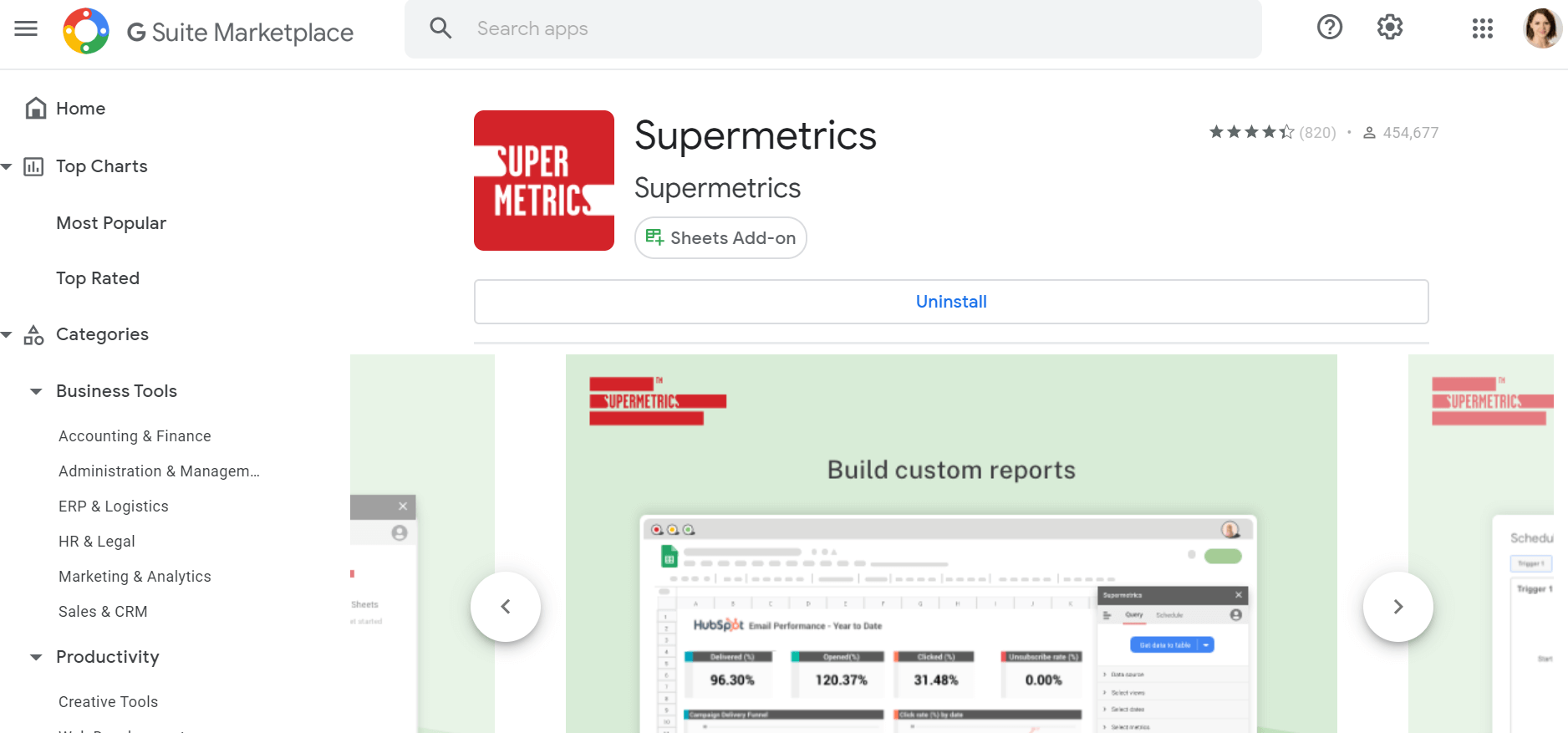 Zuallererst musst du das Supermetrics Addon für Google Sheets installieren.