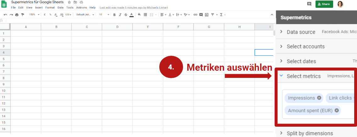 Tipp: Wenn du nicht 100%ig weißt wie die Metriken heißen, beginne einfach zu tippen: Supermetrics schlägt dir die vorhanden Metriken vor und du kannst die gewünschten einfach auswählen.