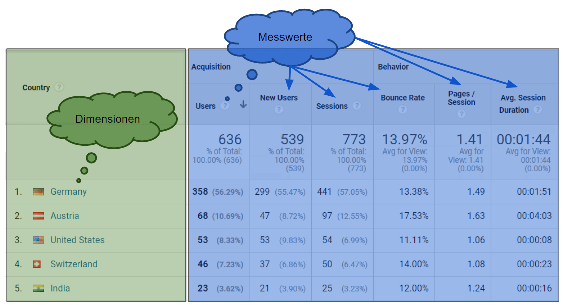 Alle Daten die in Google Analytics erfasst werden, werden entweder in Dimensionen oder Metriken gespeichert. Sie bilden somit die Grundlage eines jeden Google Analytics Reports.