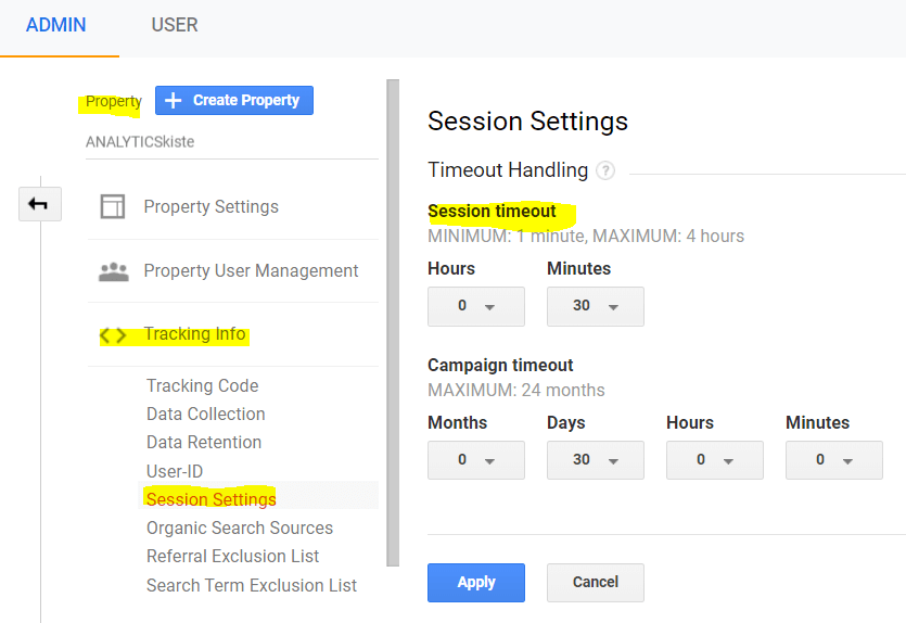 Hinweis: Du kannst das Zeitlimit deiner Sitzungen von standardmäßig 30 Minuten auf max. 4 Stunden anheben oder auf min. 1 Minute heruntersetzen – und zwar unter Admin → Property Settings → Tracking Info → Session Settings.