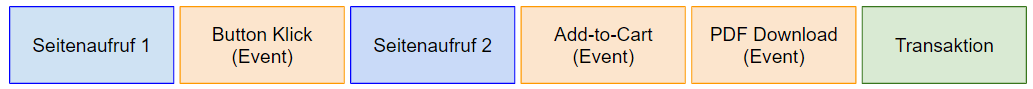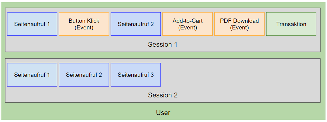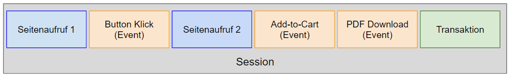 Eine Sitzung kann bspw. von einem Smartphone gestartet werden: Der User landet auf der Homepage (=Pageview), Klickt auf einen Button (=Event), geht weiter auf die Produktdetailseite (=Pagevie), fügt das Produkt dem Warenkorb hinzu (=Event), klickt auf einen PDF Download (=Event), kauft (=Transaktion) und verlässt die Seite.