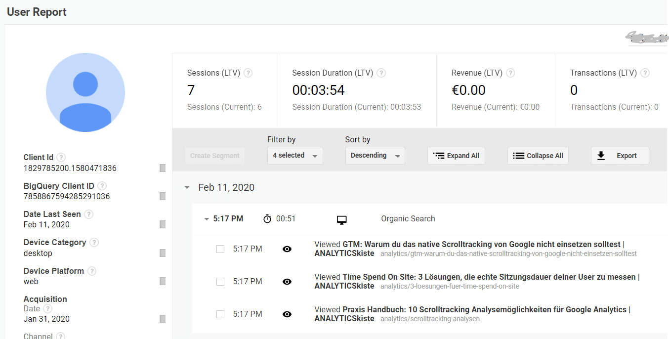 Tipp: In Google Analytics unter Audiences → User Explorer kannst du genau einsehen, welche Interaktionen einzelne User innerhalb einer Sitzung mit deiner Website hatten.