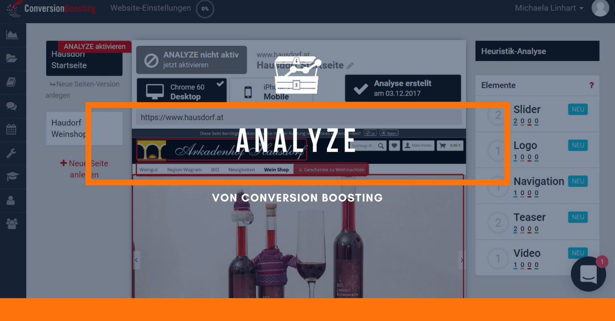 Mit ANALYZE bietet ConversionBoosting ein Werkzeug zur Conversion Optimierung an: Ein Tool, das automatisch Schwachstellen auf der Website erkennt und konkrete Optimierungsvorschläge liefert – auf Basis tausender validierter Heuristiken und langjähriger Experten-Erfahrung.