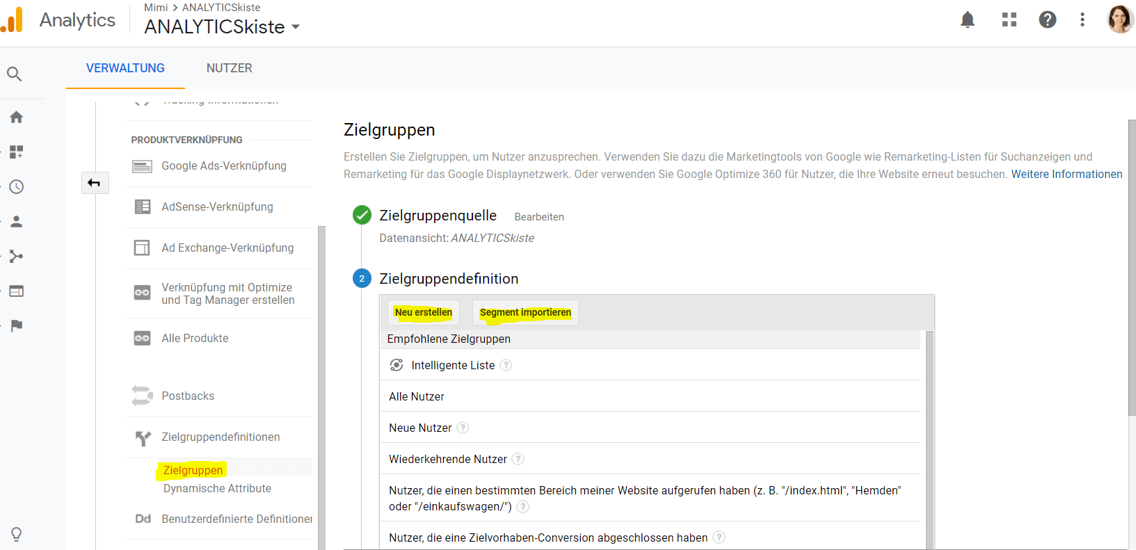 Dabei wird in GA auf Property Ebene eine neue Audience Liste erstellt, die wiederum auf einem gewöhnlichen Analytics Segment basiert: