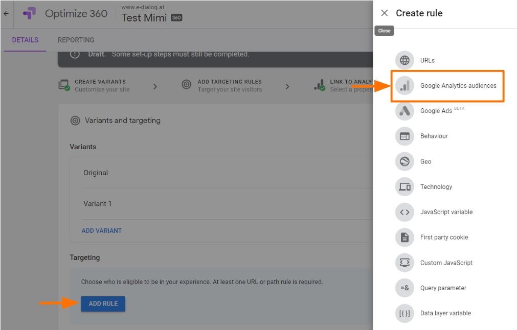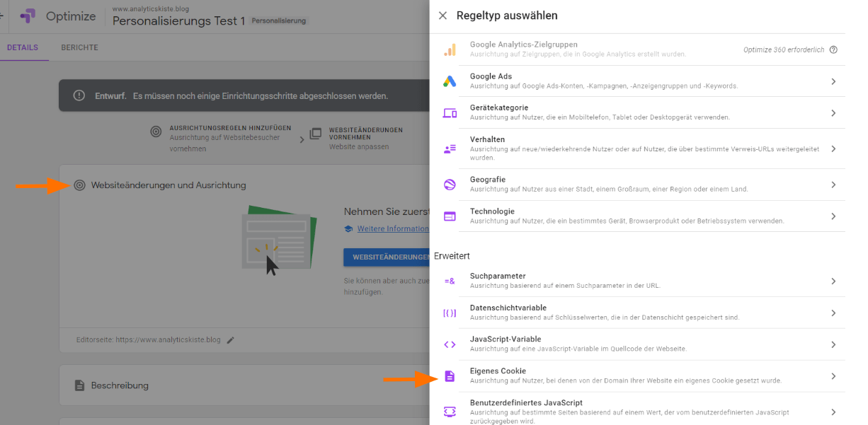 Denn genau dafür bietet Google Optimize die Möglichkeit, Regeln für die Ausrichtung über eigene Javascript- und Datenschichtvariablen, Cookies und Suchparameter zu erstellen.