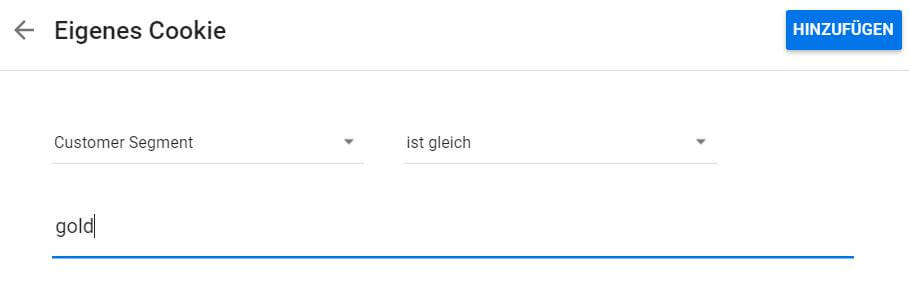 Im Anschluss wird die Bedingung gesetzt: Möchte man die Personalisierung z.B. für treue Gold-Kunden ausspielen, muss das ausgelesene Cookie den Wert “gold” enthalten: