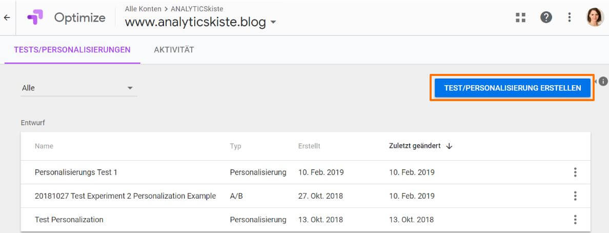 Dafür klickt man in der Optimize Übersicht auf den blauen Button “Test/Personalisierung erstellen”: