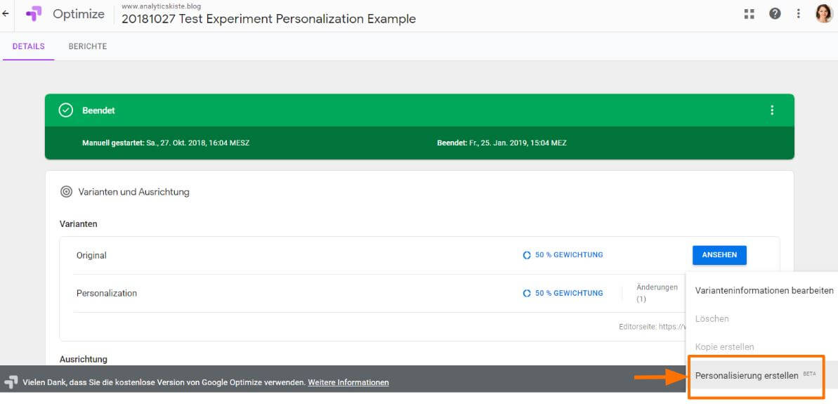 Genauso wie ein A/B/N- oder Redirect-Test kann in Optimize eine Personalisierung erstellt werden.